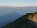 | 夕食を自炊して小屋の外に出た。管理人の渡辺さん自慢の影飯豊が次第に伸びる。Qさんは渡辺さんと楽しい会話をしている。影飯豊だけではないと小屋の周りを歩むと大日岳の夕暮や南方向の雲海と入道雲が胸を打つ。随分東に伸びた影飯豊をみて小屋に入り寝袋に潜路込んだ。夜半にトイレにでたら、渡辺さん推薦第1の天ノ川が頭上を横切っていた | ||||||||||