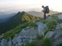 | 【期日】 平成27年8月05日(水)ー08日(土) 【メンバー】 CL:(Qさん)、メンバー:TI (合計 2名) 【アクセス】 08/04 志木21:50→池袋→22:29代々木→新宿新南口JR高速BT JR関東バス夢街道会津号23:00→ 08/05 5:20会津若松 6:18→06:22野沢駅(西会津町デマンドバス)06:00→08:36集落(弥平四郎) 08/08 飯豊山荘15:35→16:29小国17:47→19:15米沢(新幹線)→21:58大宮→22:48志木 【コースタイム】 08/05 08:36集落バス停(弥平四郎)08:45→10:52弥生分岐→11:54主尾根→11:59七森峰→12:55鏡山13:08 →14:02上ノ越→15:29巻岩山→猪鼻→16:21疣岩山16:32→17:12三国小屋(泊) 08/06 三国小屋06:12→7:56地蔵山→8:53牛ヶ岩山→09:28五段山09:49 →11:20こぶ山11:43→簡易吊橋→12:08大日杉小屋(泊) 08/07 大日杉小屋04:31→05:22長之助清水05:37→だまし地蔵→07:19地蔵岳07:36→08:28目洗清水08:57 →9:36御坪→11:25切合小屋→12:15草履塚→姥の前→御秘所→14:12本山小屋 08/08 本山小屋04:24→4:40飯豊山→6:33宝珠山6:54→千本峰→9:13休場の峰09:32→10:07長坂清水10:35 →11:14池の平11:41→11:55吊橋12:02→12:28温身平12:38→13:06飯豊山荘(入浴) |