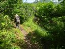 | 川入切合分岐がある五段山山頂で休憩した。刈り払い道はオニヤンマの巡視路で手を伸ばせば向こうから掌に飛び込んでくる。オニヤンマには下界の虻を退治してもらいたかった。 刈り払い道を歩んで麓を見下ろせる好展望の場所に来た。緑の麓はこれこそ・・・と思いつつ、さらに尾根筋を下って中木林に入る。周りは薄霧に覆われた。縦走路は笹や草、灌木が刈り払いをされて歩きよい。これはQさんのプランらしくない |