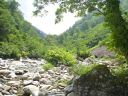 | 立派な吊橋を渡る。修復を感謝した。河原に降り、石を渡って座りやすい木陰で体に風を入れた。登山道の端には「玉川上流端」と書いた白杭が打ってあった。対岸には沢が合流した二股があり、こちらの沢の上流を振りかえると残雪のトンネルが見えた。雪崩や雪解け洪水などで吊橋が壊れる地形のようだ。登山道にはヤマアジサイが彩を添え、足下には秋の花、ヨメナ咲き始めていた。作業道らしく山道が所どころで幅を変える。大きな堰堤を右に見て林道に出た。ダイクラ尾根登山路は林道脇の細道で入り口にはヒメサユリの看板以外道標もなく、これでは林道を直進する人が出るかもしれない。温身平に向かって林道を歩む。橋を渡ると大勢の人声が聞こえてきた。森林セラピーやトレッキングをしている方たちであった。林道脇にヤチダモの大木林がある。これまでヤチダモをサワグルミと間違えてきたかもしれない。温身平に着いた | ||||||||||