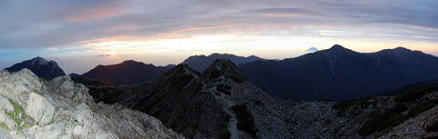 甲斐駒ヶ岳〜鳳凰三山〜北岳〜間ノ岳 手前の山塊が大仙丈ヶ岳 北岳の肩に小さく写っているのが富士山 日本の1位〜3位の高峰揃い踏み |