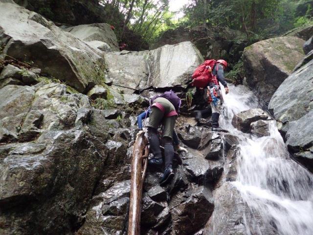 最初の滑りそうな滝、Sさん丸木利用で大助かりです
