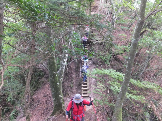 長い梯子と木の階段を・・・。 どこまでも気が休まらない登山道です
