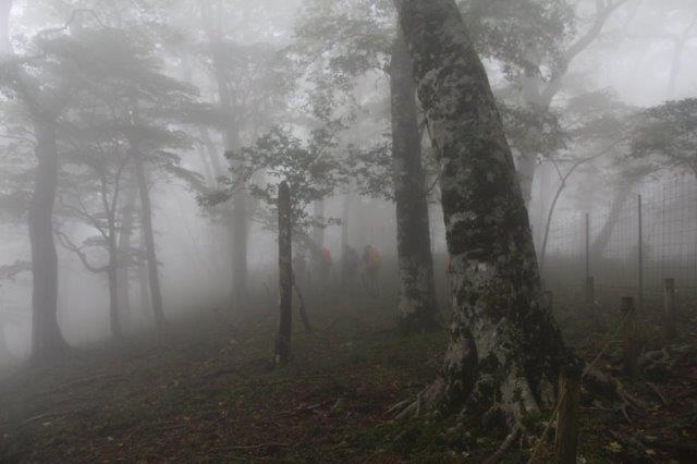 濃い霧の中を進みます