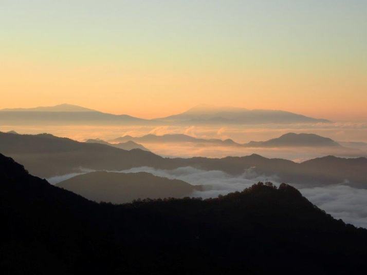 朝の風景、確か浅間山(右)と根子岳・四阿山
