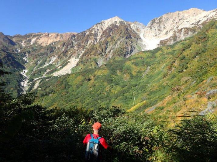 右から杓子岳・白馬鑓ヶ岳、左の沢筋に温泉があります