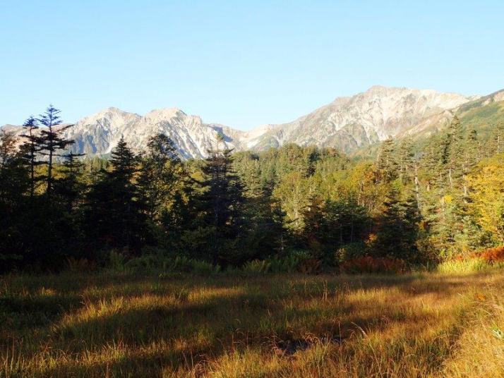 ヒュッテ脇から、早朝の白馬三山(右から白馬岳・杓子岳・白馬鑓ヶ岳)