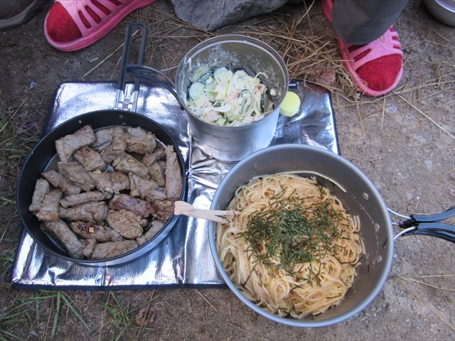ポテトサラダとステーキとたらこパスタです。さあ召し上がれ