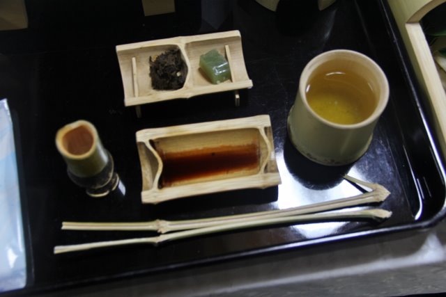 ふきのとうの佃煮、クマザサようかん、箸も竹の割りばし