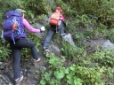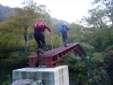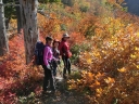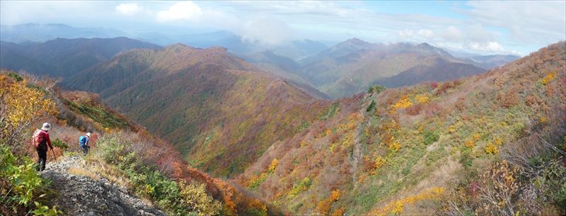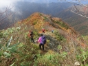 | 【コメント】 未丈が岳はとても面白い山だ。 まず入口が変わっている。 小出ICから奥只見湖に向かうシルバーラインの中に登山口がある。 見落としてしまいそうな暗いトンネルの中のシャッターを開けるとそこには別世界が広がる。 アニメの「千と千尋の神隠し」みたいだ。 昨年4月の残雪期に越後駒ケ岳に登った時に出入り口の場所は確認しておいた。 あの時はシャッターの横のドアを開けたが、トンネルの外はまだものすごい豪雪だったのを覚えている。 駐車場にはすでに数台の車があった。 いきなり渡渉をして足場の悪い道をへつっていく。 ロープがあるところもあるが、滑りやすく斜めの道で崩れているところもあり、神経を使う。 数回渡渉してだんだんと高度をあげていくとそこは本当に素晴らしい紅葉。 雪が深く人間を寄せ付けない厳しい自然環境だからこそ、色が鮮やかなのだろう。 錦秋という言葉がぴったりだと思う。 そして、越後駒ケ岳、中ノ岳と荒沢岳がっどっしりとした姿を見せてくれる。 だが、時折、熊の匂いがプンプンする。しばらく行くと又匂ったりする。 なんて言ってもここは熊のエリアだ。 熊に遭わないように熊鈴をガンガン鳴らしながら進む。 頂上まで行き、記念撮影後少し下りて熊笹をかき分けると高層湿原に続くルートがあり、なだらかな景色が広がる。銀山平の方向だ。 天気もよく、美しい紅葉と素晴らしい景色を存分に楽しめた山行であった。 コメントM/S |