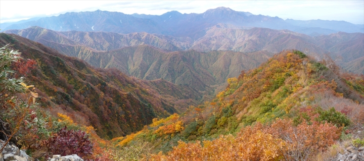頂上直下からの大パノラマ 左から荒沢岳、中ノ岳、、越後駒ケ岳
