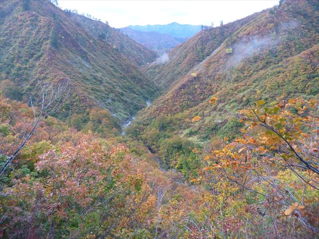 やせ尾根に乗り、高度を上げると十二単のような山ひだの向こうに荒沢岳が