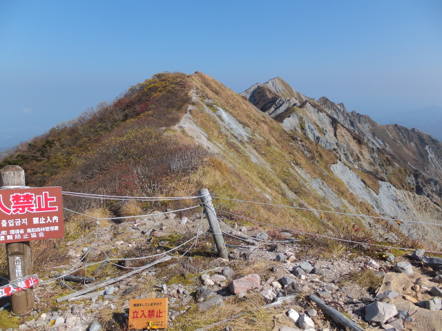 剣ヶ峰への縦走路は崩壊のため入山禁止(黄金色で綺麗です)