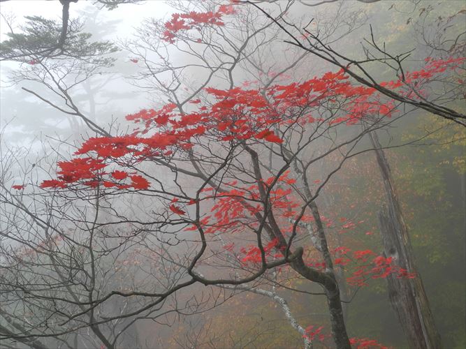 霧の中真っ赤に染まった楓が幽玄な風景を見せてくれる。
