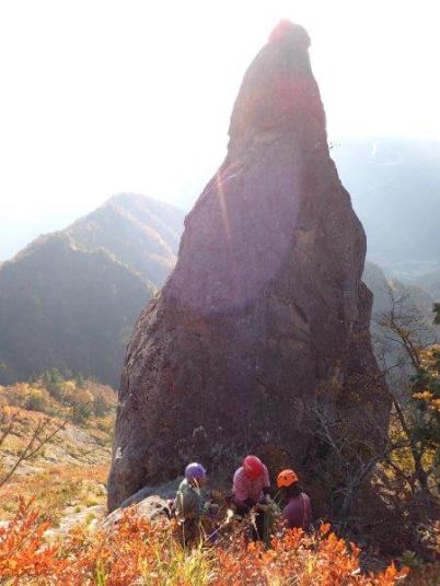 負欠岩中段でほゞ登攀終了、ロープを巻いています