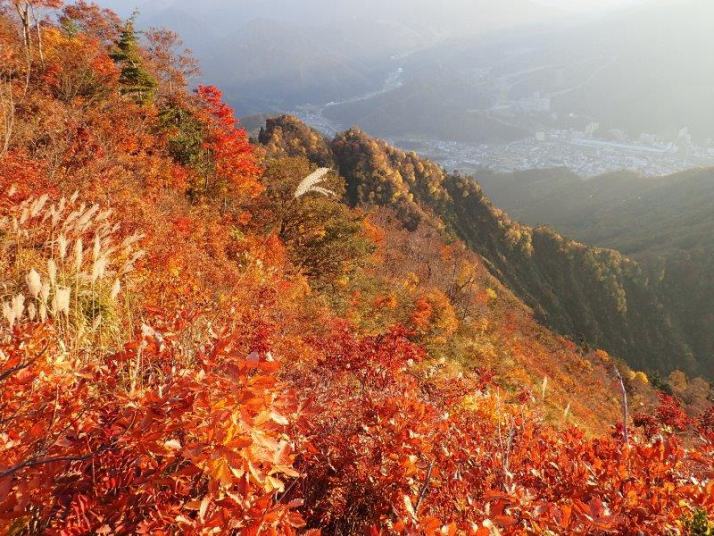 飯士山尾根ルートと新幹線越後湯沢駅が見えます
