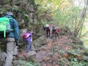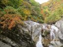 | 【期日】 2015年10月30日(金)〜31日(土) 【メンバー】 CL:To/K SL:S/W M/K L/S K/F M/F I/S T/K M/I(9名) 【コースタイム】 30日 新座発7:20=須玉IC=道の駅はくしゅう10:20=自在亭(泊) 31日 自在亭発8:40→市営駐車場8:45→竹宇駒ケ岳神社8:50→千ヶ淵9:05→旭滝 9:50→百合ヶ淵10:45→ 神蛇滝11:05〜11:15→竜神平11:25〜50(尾根道) 12:00黒戸尾根分岐→12:15駒ケ岳神社→12:20P→ 自在亭=新座 【コメント】 【1日目】車2台で自在亭に向かう。6月以来です。道の駅で仕入れたお弁当を食べた後、K草刈隊長の 指揮のもと、広大な敷地の清掃に取り掛かる。 作業員に変身した皆は熱心に働き、夕方にはとてもすっきりと綺麗になった。 キジの番が庭を歩いているのを発見!3組6羽もいる。近くのベルガの湯に行く。正面が八ヶ岳の素晴らしい ロケーションです。 留守番のSさんが大きな猿がベランダに現れ2階に行った様子でとても恐かったと言う。道の真ん中で猿を 2匹見たが、その猿だろう。自然がいっぱい!夜は持ち寄りの日本酒やワインで宴会となる。 ただ20年間何度も大勢で泊らせて頂きお世話になった、ここに座っているはずの主がいないのが何より淋 しい・・・。 【2日目】翌朝は豪華な朝食をたっぷり食べて、尾白川渓谷に向かう。駒ケ岳神社から渓谷の吊り橋を渡ると 甲斐駒黒戸尾根との分岐です。日本名水百選に選定され「南アルプス天然水」で有名な尾白川は透明そのもの。 エメラルドグリーンの淵、清冽な滝が次々に現れる。渓谷道と言っても、鉄の階段や片側が落ちた橋を渡ったり、 渓谷から離れて山道の急登があったりと、中々厳しいアップダウン。 だがあでやかな紅葉と清流の対比はうっとりと心も洗われます。3段の神蛇滝は圧巻です。不動滝との分岐の 竜神平から帰りは尾根道を行く。 こちらは歩き易く丁度良い周回コースになっている。昼過ぎに自在亭に戻ると、留守番のF夫妻がゴミの山を一つ 燃やしてくれていました。 今回は改めて仲間の絆の有り難さが身に沁みました。 (To/K記) |