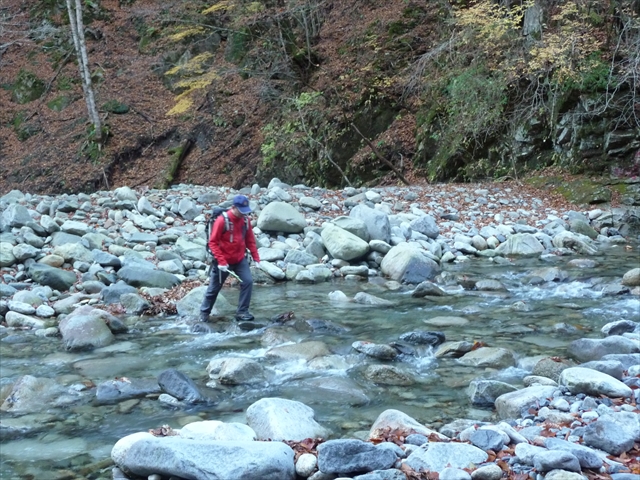 鶏冠谷出合で渡渉、今日は水量が少なく靴のまま渡れます