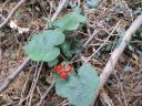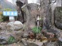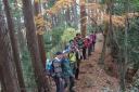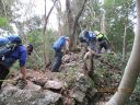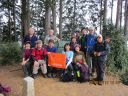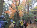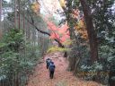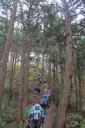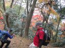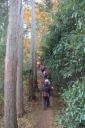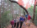 | 【期日】 2015年12月13日(日) 【メンバー】 CL:H,S S,L:M,I P,L:Y,Y(計34名) 1班:P,S:S,N S,N R,K K,W J,I S,F E,S K,O T,Y 2班:P,S:H,Y T,K T,M S,W I,S N,M S,H S,I S,A M,S T,K 3班:P,S:N,K T,M I,K T,K S,T K,Y S,K K,U T,K Y,U M,U 【コースタイム】 西武秩父線吾野駅9:35→登山口9:40→前坂(休憩)10:20→大高山11:15→12:45天覚山(大休止) 13:20→東峠13:50→久須美坂15:07→武蔵横手駅15:45 記:K,W 【コメント】 今日は一年締め括りの忘年山行。空はどんよりと、今にも降り出しそうな曇り空。 「雨さん、お願い!せめて天覚山まででもいいから、降らないで〜」と手を合わすような気持ちでスタートしたが、時折パラつく程度の小雨で合羽を着るほどもなく、計画通りのコースを歩き通すことができ、良かった。 夜の忘年会開催時刻に合わせてのペース配分がとても難しかったと思うが、全員足並み揃え、この一年を飾るに相応しい楽しい山行と終えました。 北朝霞駅を8:05分出発、吾野駅で下車。リーダーの挨拶後、3班に分かれ、スタート。線路沿いを進み、線路下にある真っ暗なトンネルを抜け、南へと向かう。 トンネル内は真っ暗で、まるでお戒壇めぐりのようだったが、出口から振り返り覗いてみると、なんと蛍光灯があり、照明スイッチが壁に付いていたではないか!ウー、知らなかったぞ〜。 登山口からいきなりの急坂を登り詰め、一つ目のピーク、大高山へ進む。 大高山はたったの493Mだ。前坂から大高山、天覚山、この先と、地図をよく見るとまるで等高線一本の単純な山道に見えるが、とんでもない、急な登りと急な坂を何度も繰り返す、非常に厳しい道のりだった。 一人で歩くにはちょっと寂しいような杉林、落ち葉に埋もれ滑りやすい登山道、つまずくと大きく転んでしまいそうな木の根に難儀しながら、さらに倒木を跨いだり潜ったりと・・・、ホッとするのも束の間、まるで人生そのもののような起伏あるコースだった。 だが薄暗い杉林の奥にはまだまだ目を引き付ける紅葉も残っており、その奥には黄色した葉が透けるように輝いていて、冬とは言え、まだまだ目を楽しませてくれた。 足元には黒い糞が・・・。杉林の奥から熊がジーっと私達を見ていたかもしれません。 両道脇には冬苺が・・・。甘酸っぱいイチゴの実は乾いたお口を楽しませ、寒椿の赤色は目を楽しませ、なかなか良いコースだった。 33名の仲間たちの弾けるような笑い声が杉林に響く。 別ルートから登って来た天覚山で待つKさんと合流し、紅葉の木の下で昼食。34名となった仲間たちは武蔵横手駅へと下山。楽しかった山行が無事終わり、第2部の忘年会会場へと向かった。 記:I,K |