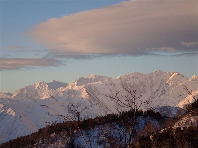 朝の唐松岳からの八方尾根、バックに五竜岳。鹿島槍ヶ岳です