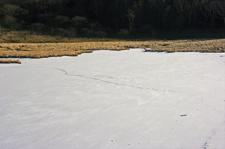 御神渡り!?覚満淵の奥では氷面に盛り上がりが見えました。