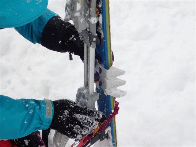 ビンディングとスキー板の間にアイゼンをセットします