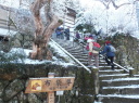| 【コメント】 新座の昨夜はかなりの雨で、後に雪になった。朝起きてみると、薄っすらと雪が残っている。 8時10分志木駅集合。坂戸で乗り換えて越生駅下車。バスに乗り、終点黒山のひとつ前の、神社前停留所で下車。 あたり一面の雪である。リーダーから簡単な説明の後、2班に分けて出発。 コースは、東武鉄道が配付している、「武蔵越生七福神めぐり」のリーフレットのとおりである。 このコースは、バスで30分くらい緩く上っていって、降りたところから、徐々に下っていくので、歩きやすい。 全洞院(布袋尊)、龍穏寺(毘沙門天)、円通寺(寿老人)、ここまでは、午前中の行動。 舗装してある山道は、雪が残っていて滑りやすい。そのうえ、上の木々からは雪が融けて落ちてくる。 展望のあるところでは、雪景色を楽しんだ。取る人もなく、樹になりっぱなしの柚子がたくさんあった。 円通寺に隣接している「自然休養村センター」で、昼食。 最勝寺(福禄寿)、弘法山(弁財天)は、梅林の多い里道を、春の気配を感じながら歩いた。 正法寺(大黒天)と法恩寺(恵比寿)は、街の中。特に、法恩寺は、駅の真正面100m。 3時ころ行動終了。越生駅前の観光センターで、解散。「ゆうパークおごせ」入浴組と直接帰宅組に分かれた。 天気に恵まれ、のんびりとした山行であった。このコースは距離が長いので、個人では、なかなか歩き通せないと 思った。 (SK記) |