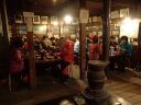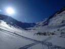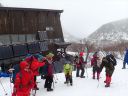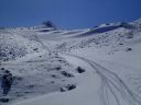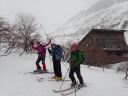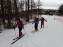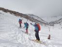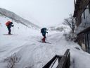 | 【期日】 【メンバー】 CL/S.A T.K M.S M.A 【コースタイム】 20日・・出発11:05―12:00昼食―12:35勢至平―13:30くろがね小屋 21日・・くろがね小屋9:08―9:40峰の辻に上がる手前の沢(引きかえし) ―10:05くろがね小屋10:40―(勢至平)―11:35スキー場 【コメント】 1日目: 山岳スキー班4名でスキー場入口からシールを付けて出発する。 ベテラン男性暴走老人2名と中級と初級のハリキリ女性の組み合わせで、 すぐ登山班を追い抜き、遠回りの馬車道を避け、旧道に入り急な林の中の 雪道を足取り軽く登行する、シールの効きも良い。 途中、昼飯休憩をして1時間半程で安達太良山の特徴のある山頂や鉄山を 望める勢至平に出た。 天気が崩れる前にくろがね小屋に辿り着くよう雪原を頑張ってクロスカン トリー走行で前進し、トラバース道を少しズッコケながらも、何とか風が吹き 始め雪が降り出すギリギリのタイミングで小屋に到着した。 昨年の同時期に日帰り温泉で利用したものの、一度は泊まってみたいと思 っていた「くろがね小屋」である。 造りも雰囲気も思っていた通りの素晴らしい山小屋で、早速、温泉入浴、 登山班の到着を待って乾杯、定番のカレーライスの夕食での楽しい一時と なった。 2日目: 寝過ぎである、10時間以上も寝てしまった。 昨晩の遅い班の食事の後に仲間と一杯のつもりで部屋で待機していたもの の、そのまま寝てしまい気が付いたときは全館真っ暗、予定していた2回目 の風呂にも入れず、やむなく朝までの就寝となってしまった(何人かは団欒 したようであったが)。 予報通り、外は夜半から南岸低気圧通過での影響であろうか風が吹き荒れ、 小屋ごと吹っ飛びそうな荒れ模様である。 朝の気温は0℃、この時期異常に暖かく、雪は少なく昨晩もほとんど降っ てはいない。天気は快方に向かう期待大であったが、いつ治まることか、風 が半端ではなく凄い。 朝食は6時、まもなく登山班は登山中止を決め、スキー班は様子を見なが らの待機とした。 出発していく他のメンバーも窓越しに間断なくやってくる烈風に身構えな がら戸惑っている様が良く見えた。 9時少し前、登山班の下山を見送ったあと、スキー班は時間的に余裕もあ るので予定通り頂上へ向けて出発することにし、シールとスキーアイゼンを 装着し登行を開始した。 この頃より太陽が顔を出し始め青空が出てきたり、突風の間隔が長くなった りで、何とか予定のコースを行けそうな感じではある。 小屋からはいきなりの急登で、さらに踏み跡の雪が硬くなっていてシール 歩行がし難く斜面をジグザグに登行して尾根上に出た。 ここから上は広い丘陵尾根上を行くのがルートであるが、あまりにも風が 強すぎるので、そのまま尾根を通り越し左の沢に入り詰めることにした。 沢の中は雪で埋まり傾斜も緩く風も幾分弱くなって歩き易いが、それでも いきなりの突風はやってくる。風上の木立の揺れと風との唸りの音が聞えだ したら、瞬間それなりの態勢をとれば何とかなるものの、慣れない女性連は そうはいかず、転倒したり、帽子を飛ばしたりのドタバタの登行となった。 これから沢を詰めて尾根に出ればさらにひどい状況になることは明らかで、 30分ほど登った沢の上部で引き返すことにした。 ここから左へ少し登り、直接、勢至平へ出るルートも考えたが、止めにし て、そのままシールを付けたまま沢を滑走、くろがね小屋へ戻った。 小屋でシールをはずして一休み、後は昨日来たルートを下山、勢至平から は旧道ではなく馬車道を滑走し、1時間足らずでスキー場(奥岳の湯)に到着、 山岳スキー班合宿の終了となりました。 (S.A) |