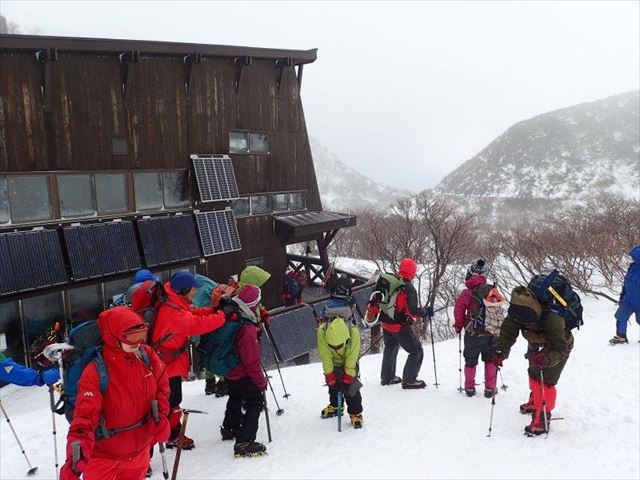 登山班20名、山小屋前で下山準備です