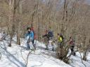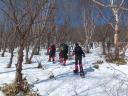 【コース】中級コース 赤城山(地蔵岳) 【コースタイム】ビジターセンター9:30→覚満淵→鳥居峠10:00→長七郎分岐10:35 〜八丁峠10:55〜地蔵岳11:40〜12:20〜スキー場13:10〜ビジターセンター13:20 (記録:T/Y) 【コメント】 毎年好評の西部ブロック主催の「スノーシューハイク」に参加しました。朝からお天気が良く、最高の登山日和でした。心配だったのは、山に雪があるだろうかということでした。覚満淵に着いたら少なめでしたが、雪は確かにありました。 早速スノーシューに履き替えて歩き始めました。小沼長七郎分岐で、初級と中級に分かれました。中級組は八丁峠、地蔵岳に向かいました。ずっと登りが続きましたが、木立の間をスノーシューで思い思いに自由に登りました。1時間ぐらいで頂上に着きましたが、そこは素晴らしい眺めでした。 昼食後、下り始めましたが、急な下りが続き、スノーシューを横に向けると尻餅をついて、尻シェードで下りたりもしましたが、何とか無事に下りることができました。下りは思っていたよりも苦労しましたが雪を堪能することができ、さわやかな汗をかき、満足のいく山行でした。他の会の人たちとも交流ができました。 (Y/S記) |