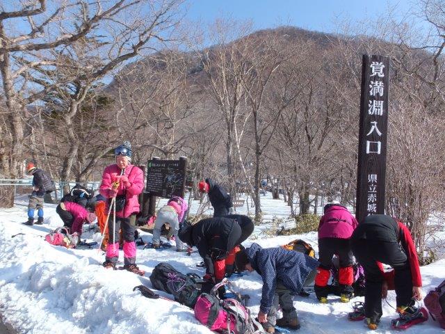 覚満淵入口でスノーシューを着ける