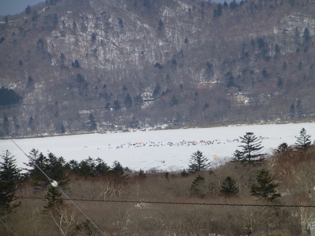 大沼でわかさぎ釣りをしているテントが見える