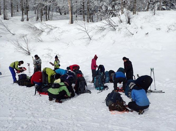 栂池ゴンドラ終点で、1班準備、スノーシュー装着です