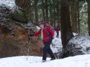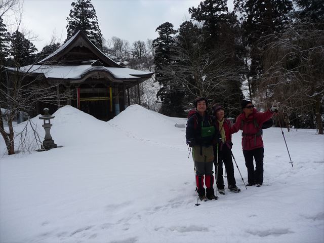 翌朝は、登山口手前の駐車場に向かい、登山口の二王子神社まで雪道を約1時間歩きます。