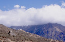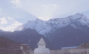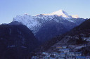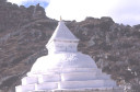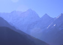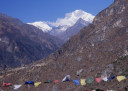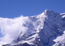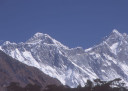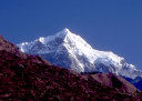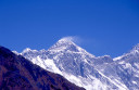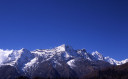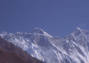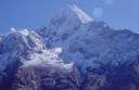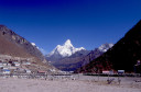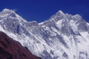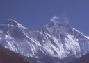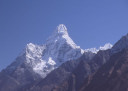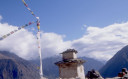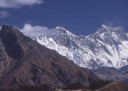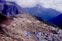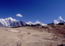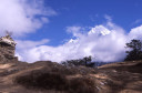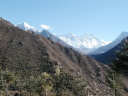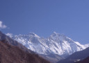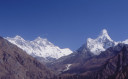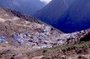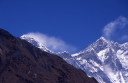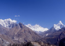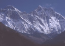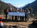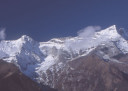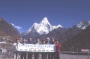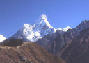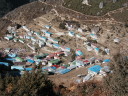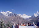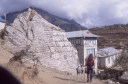 | 【エベレスト街道・トレッキング:行程】 11月 6日 ナムチェ・バザール→シャンボチェ空港→エベレストヴューH→クムジュン東分岐→クムジュン村 →シャンボチェ空港→クムジュン東分岐→ナムチェ・バザール 11月6日 少し酸欠か?朝起きる時、違和感がチョット、洗面用の湯と目覚ましのお茶を用意してくれたのを飲んで元気に 出発、いよいよ今日は展望台に登って念願の山々とご対面、白銀のヒマラヤ襞をまとったアマダブラム、それから 谷の奥の方に名に聞くローチェ、その向こうにヒマラヤの盟主エベレストが三角錐の形で鎮座している姿が今目の 前にある、とても素晴らしい雄大な眺め。 それから更に350mくらい直登ぎみに登ってシャンボチェ空港の東端を通りパノラマホテルの脇を通ってエベレ スト・ビューHへ、もうここまで来ると360度高峰の眺め、結構高度(3850m)に来ているはずだが皆元気、意気 揚揚として歩いている、谷に面したアプローチを左に曲がりこむと広い草原状の向こうに松林が見えてきた、松林 のあるところがエベレスト・ビューHだから、此処で写真撮っていっても良いとKさんのOK、ダワ・ヌルが一緒に残 ってくれて暫し撮影、日差しは強いが、停まっていると結構温度は低く、冷えてくる。緩やかな芝生状の道を進んで 石段を左に回りこむとホテルの玄関へ、ロビーを通過してテラスへ、絶景!(先着の皆も興奮状態・・・・・・・) 石畳 のテラスに白いテーブルとベンチがあって、他の客達も含めて、この素晴らしい眺めを。お茶もそこそこに記念撮 影に忙しい。 一人一人記念のポーズで、グループで・・・・・。アマダブラム、タムセルク、カンテガ、ローチェ、エべレスト、タウチェ、・・・・・が正面に、あっちがタンボチェ、その先がパンボチェ、振り返ればホテルロビーの大きな窓にも同じ風 景が映って、もう本当に堪らない光景を満喫。(後で気がついたが、此処でコーヒーだけで水分補給を怠ったのが 、数時間後に効いて来た)、何時まで眺めても限が無い光景と分かれクムジュンに向かう、ホテルの玄関先に小さ な鯉のぼりがはためいていた。林の中の小道を下ってサンナサ経由石垣に囲まれた(畑?ヤクの放牧?)が続く 平坦な道を通ってクムジュンへ、中心部近くのアマダブラム・ロッジで昼食休憩、先の油断が祟ってか、昼食のラ ーメンが喉を通らなかった、レモンティーを貰って意識して水分補給・・・。 ロッジの裏庭に出てみると、またまた素晴らしい眺め、両側から下りて来る稜線の間、今通ってきた道の向こう に「アマダブラム」がとても美しい姿だ。背景に全員でポーズ。 水分を補給してずいぶん気分も良くなってきた、やはり水分補給 をずぼらしてはいけない。 アマダブラム・ロッジを後にして、真っ白いチョルテンの前を通って、クムジュンの学校へ、いろいろな国の援助で 建てられたと言う校舎が並んでいる、学校はティハールの関係で休み、留守番の先生に持参のプレゼントを託し、 皆で記念撮影。 ナムチェの子供たちはこの学校まで毎日30分の道のりを通うそうだ。(因みに我々の行程は2時 間弱)。 外は快晴で日差しは強いが、空気は冷たい、日陰側は冷える。学校を後にして、シャンボチェに向かっ て緩やかな登り、途中、一人の老人に追い抜かれた、Kさんがいい風景だから写真を撮らせてもらったら?と、ダ ワ・ヌルが通訳してくれて、話がまとまり、雲間に聳えるタムセルクを背景にポーズ、チベットから歩いて2日、雪の 峠を越えてきたとか、とても信じられない行動力、ナムチェのバザールに行くのだとか、自分は急いでいるんで・・・ 、と、そこで足止め料20ルピーを払って、ニッコリ合掌、でも良い写真が撮れて、相手も喜んで結果OK。 峠状の地点で休憩、ここからのタムセルクもとても素晴らしい、でもじっとしていると冷えてくる。ナムチェ側の下 りに差し掛かると石垣で囲んだ土地がいくつか、国営のヤクの牧場だそうだ。 今朝登りに通った、シャンボチェ空港の東端とは反対の西端を通ってナムチェの見えるところまでくると、ストー バにタルチョがひるがえっている、聞くとこれはダワ・ヌルのお祖父さんのお墓だそうで、通りすがりにお参りしてき た。どうもかなりの実力者だったように感じる。ナムチェへの入り口の巨大なマニ石を見て、町には入らず、右下 に眺めながら迂回して、朝割愛した、国立資料館・博物館へ、ここにはチベット族の古い民具・生活用品が展示さ れており昔の生活スタイルがしのばれる。 一方は歴代のエベレスト・サミッターにまつわる写真、資料が展示されており、幾つか見覚えのある写真があっ て興味深かった、何故か、結婚式に参列した若いダワ・ヌルの姿も。外へ出てみると雲の量が増えて、コンデ・リ の夕景は見られたが、ついにエべレストの夕照は見る事ができなかった。 サクラ・ロッジに戻り、4階の部屋に戻 ると、暗がりの中から誰かが呼んでいる、昨日から誰かが隣の部屋にい