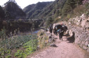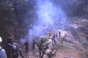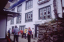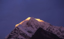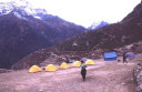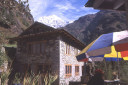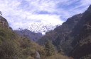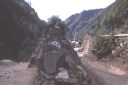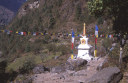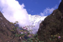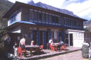 | 【エベレスト街道・トレッキング:行程】 11月 7日 ナムチェ・バザール→トップダラ→ジョルサレ→モンジョ→チュモア→ベンカールの橋→トクトク →パクディン→ガート→チョプルン→ルクラ=ホリデイロッジ泊 11月7日 いよいよ下山の日だ、素晴らしい眺めを胸に詰め込んで、素晴らしい白銀の峰々を朝な夕なに眺めることがで きた満足感をお土産に。 食堂には朝早くから、帰りの仕事にあぶれた老人ポーターが仕事をねだりに来て、年老 いた身の生活の厳しさを垣間見る様で、Kさんがさりげなくチップを渡して・・・、Kさんも気を使って大変だな。 ロッジの前に皆そろって、ディリーとお手伝いの少女と一緒に記念撮影、ディリーから帰りの無事を祈ってスカー フを各々の首に巻いて貰い、いよいよお別れ、ありがとうございました、大変お世話になりました。通り道昨日の土 産物屋のディリーにも挨拶を忘れず、ナムチェのはずれでは、野生の孔雀が二羽餌をついばんで遊んでいた。 トップダラの曲がり角からもエベレストは雲の中に隠れてしまっていた。登り時話しかけられたMさんに出会った 、我々同様下りで、最年少エベレスト・サミッターの少年とも一緒だった、登頂時は十五歳、現在は既に十六歳に なっていると。ここでも彼と皆が記念撮影。気さくな少年で、テンバ・ティェリン・シェルパとサインをもらった。 (最年少登頂記録も今年の五月十五歳の少女の成功で更に更新されたそうです。) ジョルサレ、モンジョ、チュモア、ベンガールの橋、トクトク、パグディンと既に見慣れた風景の下り道を快調に下 る、途中、昨日訪問したクムジュンンの学校の先生二人が休みを終えて登ってきたのに出会って暫く立ち話(勿論 、ダワ・ヌル〜Kさんの通訳経由で)最近、クムジュンの学校にもPCを7台導入した、また、クムジュンまで指導に 来て欲しいとか・・・、それから、Kさんが始めてネパールに来たときのガイドにも遭遇、十数年ぶりとか、お互い懐 かしの記念撮影・・・、この街道の物流の機動力はゾッキョと人間、それを端的に表している風景に出会った、二人 のポーターがそれぞれ身の丈より大きな合板を担いで石段の上で休憩していた。 ガートだかチョプルンだったか、かの田部井さんの支援で作られた林檎の畑、現地人と結婚して住み着いた老 日本婦人の家、子供づれながら酔っ払って休憩しているおばちゃん・・・・いろいろな風景を見ながら下ってきたで もこの街道は今の風景のままでずーっと居て欲しいなと感じるのはあまりにも勝手だろうか。 帰りは頑張って一気にルクラのホリデー・ロッジ着、ここのオーナーはアナンさんと言ってかつて多くの日本人隊 をガイドしてエベレストにむかったそうで、日本語もかなり話せた、埼玉から来たと言ったら、「川越に行ったことが ります」と返ってきた、加藤保夫さんと登ったことが縁で行ったそうだ。 サインをもらったり、ダワ・ヌル得意の絵をそれぞれTシャツに描いてもらったり、お礼に皆で合唱したり、・・・楽し い夜のひと時を。 |