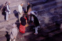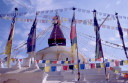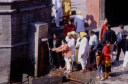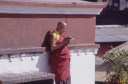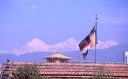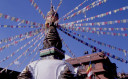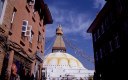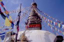 | 【エベレスト街道・トレッキング:行程】 11月 9日 カトマンズ市内見学=スワヤンブナート→パシュパティナート→ボーダナート 市内自由見学=アサン→ハヌマン・ドカ→タメル 10月9日 いよいよ帰りの日、快晴窓辺に映るカトマンズの日の出が美しい。 現地ツアー社の社長が来られたり、Kさんの妹さんの友達だと言うRさんで観光飛行機のパイロットとか、いろい ろ事業プラン・・・・を、とそんな話をしながらゆっくりと朝食を、残念ながら自分はモーニング・ティーで我慢、胃腸 の働きすぎを抑えるには絶食に限る。 マイクロバスに乗り込み、日本語の流暢なガイドのおじさん?の説明を聞きながら、街中を通って、観光の名所 へ、まず最初は「パシュパティナート」ネパール最大のヒンドゥー寺院だそうだ、よく写真とか本でみるインドの聖地 、ベナレスの沐浴場を小さくしたような感じもする、川沿いの階段、配置される火葬台(ガート)、その下の川で沐浴 する人々、おりしも一体の葬送の準備が進められる風景が対岸にあった、白い布で包まれ木組みの担架に乗せ られ、多くの花に飾られて・・、橋を挟んで利用者の身分を分けているそうだ、まさしく上流は・・・。 門前には、花売り、香料、鮮やかな色の粉? が売られる出店が並び、姦しい呼び込みも。門前を後にして次は 、「ボーダナート」へ今度はネパール最大の仏塔(ストゥーバ)が建つチベット仏教の巡礼地だそうだ。観光案内パ ンフレットには必ずある風景、白いお椀を伏せた様な上にかの“目“が描かれた建物に、上の尖塔から幾筋物張 られたタルチョ(赤=火、青=空、黄=地、緑=水、白=風を表現)の布地に経文が印刷されている)が真っ青な 空にはためく、巡礼と思しき人々、僧侶、そして観光客。中国がチベットを武力併合した後、チベット文化がこの様 に場所を替えて人々を惹きつけて止まないそうだ。 基壇部分にはマニ車が沢山仕組まれていてそれを回しながら右回りに巡回、若い少年僧が、当に向かってひた すら読経、礼拝する僧侶の姿・・・、基壇の上に上ってみると、周辺の、幾つかの僧院の屋根越しに真っ白なヒマラ ヤの峰が望まれる、その向こうにはチベット仏教の故郷、ラサが在るのだろうか、先日クムジュンで出会った老人はあんな高みの峠を越えて来たんだろうかと想いを馳せる。境内周辺の土産物店を物色して、次の「スワヤンブ ナート」へ、カトマンズの市外を通り抜けて反対側、西方の緑に囲まれた高い丘の上に建ち、ネパール最古の仏 教寺院。 ここからはカトマンズを見下ろすことができる。 バスから下り、坂道を、我々がホコリ除けるためマスクをして登っていくと、通りすがりに欧米人?が「ノープロブ レム、クリーン」と話しかけてきた、我々は少し神経質になっているのかな? 建物の姿は先のボーダナートに似て いるが“目” の上の尖塔は五輪状の物が何層もあって尖がり帽子の様に高い、矢張り、タルチョが幾筋かはため いている、正面に巨大な「金剛杵」が安置され、本尊は「大日如来像」が安置されているそうだ。 境内には蝋燭、灯明の油の煙が立ちこめ独特の匂い、雰囲気が漂う中、大勢の参拝客が詣でている、真言密 教の寺院だった。伝説ではその昔、カトマンズ盆地が湖だったころから丘の上に建てられていたそうです。市内観 光を終わり、ホテルに戻ると来週からアンナプルナ方面に行くと言っていたダワ・ヌルが、時間が空いたからと午 後街中を案内してくれると言う(是も帰りの飛行機が遅れた為に出来た時間の活用に、Kさんの気配りで)今度は 歩いて街中へ、まず腹ごしらえから、昼は久しぶりに日本食を食べに、タメル・チョーク(四辻)、タヒティ・チョーク、 アサン・チョーク、ここでは香辛料が沢山そろえて売られており、白、黒の胡椒をお土産に、インドラチョーク両側に は生活用品雑貨を所狭し、と、積み上げた店が並び買い物客で一杯、金物、真鍮の器などが目立つ、さながらカ トマンズのアメ横と言った所か、興味深々にぶらぶらとこんな所を経て旧王宮のあるダルバール広場へ寺院、博 物館、寺院の有る一帯は入場料がいる、いかにも年代を感じさせる建物が並び、軒下で行者(サドゥー)と思しき 人が瞑想したり、話し込んだり、通りすがりの人に声をかけたりしている前を通って庭の奥のほうに進むと、細か な木彫りで飾られて中庭を四方から囲む形で建てられた「クマリの館」と言うのがあって、中庭に入って暫くすると 二階の窓から「女神クマリの化身」と言われる濃い化粧に着飾った少女が一瞬顔を出した、すかさず写真を撮ろう としたが、制止させられて残念、それにしてもなんとも不思議な人生を歩まされる人もいるもんだ、今の日本では信じられないな、そんな感慨を抱いて門をでた。 祭りの日には生贄にされる牛の血で真っ赤に染まると言う広場を通り、旧王宮をあとに。 観光では体験できない通り、カトマンズの人々が日常使う裏通りの喫茶店?で飲み