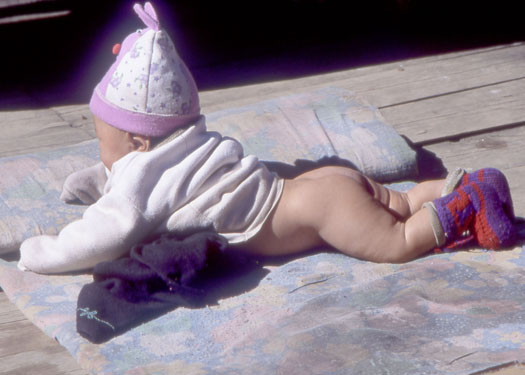 オイルを塗って日光浴をするシェルパの幼児