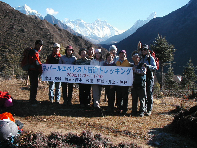 ナムチェバザール 国立公園展望台より、クンブヒマール山群を背景に、 ハイポーズ