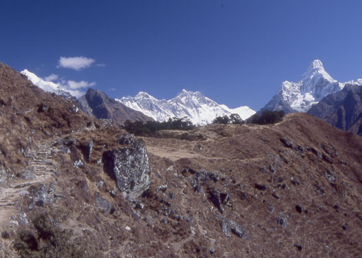 H・エヴェレスト・ビューの松林が見えてきた、エヴェレスト、ローチェ、アマ・ダブラム