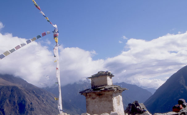 ナムチェバザールの高台に立つガイド、ダワ・ヌル・シェルパの祖父を祀るお墓