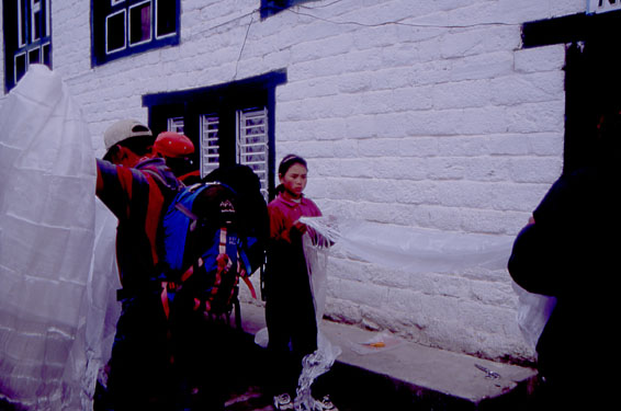 サクラ・ロッジ前、下山の無事を祈ってカター(スカーフ)を頂く