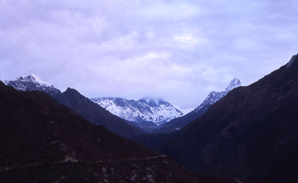 朝日のヌプチェ、ローチェは雲の中、アマ・ダブラム