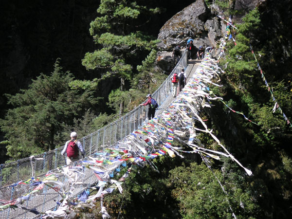 吊り橋には五色の旗(タルチョ)がたなびく