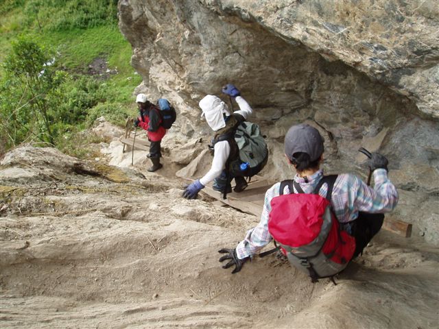 滑落しそうな場所には木製梯子