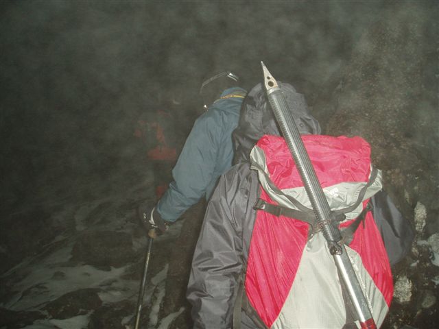 バックパックを背負い、ピッケル