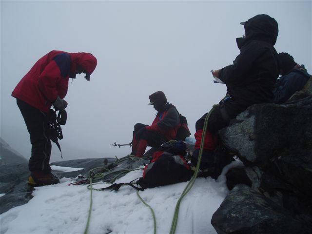 エレナ氷河末端の岩場でクランポンを外して