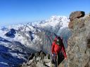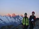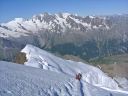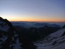 ☆8月1日(木)4000M峰 ワイスミ−ス(4023m)峰縦走 晴天。朝3時半起床。4時朝食。4時40分アルマゲロ小屋発。本番さながらの、ヘッデンをつけての今日の朝の第一歩は緊張する。岩稜帯を歩き始めて一時間すると、モルゲンロートの朝焼けが目の前に。素晴らしい光景だ。そのまま岩稜地帯の急騰を息を切らせて登り続けると、やがて急峻な雪稜地帯に変わる。ここを4時間ぐらい登り続け、また、岩稜帯そして雪稜と幾度となく繰り返される。やがて、現地コースタイムで山頂を踏んだ。石坂ガイドが、頂上で握手をしてくれた。休みなく下山開始。下山の最初は雪壁だ。 下降は急駿ではあるが、思ったより楽で、ドンドン降りられる。ホーサース小屋11時50分着。昼食を取る。一座目が割と調子がよかったので、登頂を祝い祝杯!私は、体力が心配だったので、スパゲティーナポリタンを頼み、一皿全部平らげた。 Mさんは、欲しかったそうだが、人に分けるという余裕が私になく,とにかくお腹がすいていた。コーラが以外とあい美味しい。 この山の頂点から見えた山々は、モンテローザ。サースフェーの山々。アラリンホルン。ドーム。カストール。リスカム。ブライトホルン。アレッチホルン。ユングフラウ。フィンスターアールホルンでした。アルプフ―ベルは、特に台形の山で特徴がありすぐ覚えられました。その下に必ず氷河が広がっており、素晴らしい眺めだ。昼食後、今夜の宿、ワイスミ−ス小屋(3098m)に向かう。午後一時には山小屋に到着。 高度差1000m近くを登ったのだ。下りも実に快調なスピードと足取りで楽だった。石坂さんも、「すごくいい調子」と、褒めて下さった。 雪渓・雪稜下りの練習はザイルパートナーのH氏に日本で、「遅いぞ、遅い、もっと、自信を持って、踵重心に。姿勢よく。早く歩く!」と叱咤激励されながら、穂高岳、富士山、金峰山、千丈岳でと雪をあちこち求め、また 雪のない岩でも練習しました。その甲斐があったな〜と、練習が生かされたことを嬉しく思った。 「よかった〜。こんなに楽なのは練習してきたからだもんね。」楽しい楽しい縦走でした。 それでも、こんなこともありました。下山途中のセラックの下降の所で、登って来る人と交差した時、ガイドの石坂さんは踏み跡を譲らなかったけれど、つい私は後ろの人に急かされ譲ってしまい、踏み跡からそれ、左に僅か10p横にずれた、その時、乗った雪の足元の雪が崩れ落ち、深く左足が落ち、雪にはまった。 右足が出ていたし、アイゼンをはいた足の抜き方は心得ていたので事なく抜けたが、それでも、すぐには抜けず何回か、試みなければならず、内心ヒヤッとした。石坂さんからは、「自分がしなかったことには意味があるのだから、勝手に考えて安易に氷河の所で相手に道を譲らないように」と初めて、厳しく指導された。 同じような事だが、登山学校でも、「渡辺のやることには意味がある。行動をよくみておくように」と、先生から実習で言われたことを思い出し反省した。 氷河地帯を通過していることは、石坂ガイドが走るような早足になったのと、周りの様子で理解していただけに、今一歩の注意力を持てなかった自分が情けない。そういえば先生は、赤岳でも、どこでも、岩と冬山では絶対に道は譲らなかった。相手が抜かしたいなら抜かしていけというスタンスだったような気がする。 先生曰く「私達は初心者だ。譲るのは技術が上の人がやることだ。技術の低い初心者は譲ってはならない。」とおっしゃったことを思い出した。雪山は、今登攀している山の地形や、雪の状態に熟知していないと、一歩間違えれば、大変なことになるということだったに違いない。初心者の私等は、山を知ったかぶりや、奢ってはならないという戒めなのだ。 簡単な山で難しいことを想定して実習するからこそ、難しい山でなんとか事故を起こさずに済むのだ。先生の指導のあり方がいかに実践的であったか、いまさらながらよく理解できた。(渡辺先生はやっぱり凄い!)強風の時の雪の歩伏前進も、よく練習させられたが、当時「ウソッ!でしょ」と信じ難く練習に熱が入らなかったが、冗談ではなかったのかもしれない。 その昔、ヨーロッパアルプスを自分の庭のごとく登り、知り尽くしていた先生。素晴らしい先生に教えて頂いていたことを懐かしく誇らしく思う。と共に、先生が縦横に歩いていた地に自分も今たっていることが、何とも言えず、とても嬉しくもあった。 |