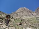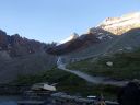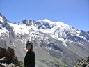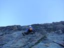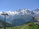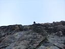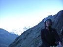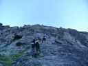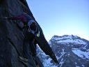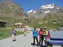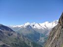 ☆8月2日(金)ラギンホルン(4010m)の岩登り 十四ピッチですよ〜。 なんてすごいの! 楽しいの! 四時起床。四時半朝食後、暗い中ヘッデンをつけ出発。本番を意識しての出発だそうだ。 荷物を全部持ち、今日は300mの高度差をこの高所で、十四ピッチで登ります。十四ピッチなんて日本でしたことないよ〜。足はどうなるんだ?不安!五時十五分小屋発。暗い中、本番さながらに岩に向かう。 エイベックスのファミリーが現れた。ベービーが3〜4頭いてとても可愛いい。のんびり朝食だろうか草を食んでいた。六時岩稜の取りつき。 ここから私は、石坂ガイドと、Mさんはマルコと組む。 今日は @岩の楽なコースを目で見つけ素早く登るコースを決める。がテーマのようだ。後, Aガイドの跡をどれだけ正確に足跡を追えるか。 Bロープに沿って、ヌンチャクをとりながら、まっすぐに登ってこれるか、など、など等。だってテストだもん。 C時間もみられているし・・。岩は体力がいるけど、とても楽しく、飽きることがない。3ピッチ目で、朝見たエイベックスはもう見られなかった。昨日小屋で一緒のテーブルになり、楽しく夕食を頂いた6人組の若者のグループが、後から追いかけるように登って来た。彼等はさほど速くないけれど、先を譲る。 少し危ない支点の取り方もするし、小石も落とすし、先に送りだしておいたほうが、われわれが安全かもとの判断かな。セカンドの女性が、「ハッハッー」とわざと息を切らせ、「大変ね」と言う挨拶をユーモアにした。 私も「ハッハハー」のゼスチャーをして二人で大笑いした。十一時二十分頂点に着く。十字架があり、その下にアルミの箱があり、名前を記入するようになっていた。石坂ガイドが、「登頂!」といって頂点にとび出たことを教えてくれた。マルコが4人の名前を記載してアルミボックスにまた戻してくれた。「キャホー!!」約5時間の岩登りなんて!「キャッホー!キャッホ―嬉しいよー。」なんて、素敵なんだ!頂上から見る景色は、これまた最高パノラマビューだ。晴れた青空の中、雲が一つもなく、石坂ガイドと、ここでもがっちり握手。下山も快調で、時間もテストはパスのようです。飲まず食わずの5時間だった。 バスで、ザースフェーに戻りました。 懐かしいホテルに着きシャワーを浴びてから、マルコとお別れの夕食会をしました。美味しいお店でスイス料理を頂きました。チーズフォンジュウ、パスタ、ピザ、サラダ、生ハムの盛り合わせ、ワイン赤白一本ずつを頼んだ。私はアイスクリームもついでに頼んだ。 3日間練習&登山試験?が無事終え、やっと一山越しました。ヤッター! |