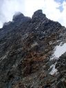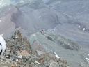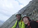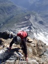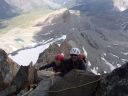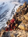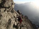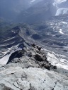 ☆8月5日(月)「久保さん、あきらめない心!だよ」 マッターホルン(4478m)登頂! 朝三時五十五分起床.快晴。無風。気温も高い。 夕立の恐れもないそうだ。食事四時。真っ暗な中、ヘッドランプを頼りに、 小屋の外に出る。 一斉に皆が飛び出すように外に出る。 小屋の裏から、急な登りがしばらく続く。朝一番はこの登りがきつい。暗い中を取りつきまで来て、昨日の学習通りにステップに足をかけた。もたついては行けない。「いいぞ!」と石坂ガイドが励ましてくれる。 暗い中ひたすらクライミングが続く。先行パーテイのヘッデンの明かりと、後発隊のヘッデンの明かりが、一列に並び、キリマンジャロ登山を彷彿とさせる。違いは、こちらは岩山で、クライミングということなので、息が切れる。同じ高所だが、こんなにも、体力の消耗がちがうのか?足が慣れて来る頃、朝日が、マッターホルンの頂上を赤く、燃えるように照らしていた。でも、横眼でチラッとしかみれません。 日本で、アンチョコ用紙を作成し、どこまでが何時間、どこに何があると書いて一生懸命イメージトレーニングしてきたが、今は頭の中は真っ白で、思い起こすこともできない。 ただ、目の前の岩を両手両足を使い、石坂ガイドに遅れないようにして、登ることで精一杯だった。切り立った岸壁を登り、4003mのソルベイ避難小屋に着くが、休むことなく進む。その先で、アイゼンを装着した。覚えているのはここまでだ。 後は、無我夢中で、何をどう登ったのかよく覚えていない。断片的,順不同だ。雪渓と雪をアイゼンで登り、固定ロープを頼りに使い、150〜60mはあろうかというソルベイの上の垂直壁を登り、(マッターホルンの肩では雪が多くついていた)、逆L字のフイックスを腕力で登ったあたりからは、また鮮明に、よく覚えており、ショートロープで体を引き上げ、雪渓を登る。降りる人で、ごちゃごちゃ、して危ない。 最後にガイドたちが置いたという、頂上直下の聖ベルナール像を見ながらほんの5分ぐらいで、頂上の雪の細い、稜線に飛び出た。 「久保さん、頂上だよ。」石坂ガイドの声で、ここは何度もネットで見た景色だ!と感動した。みんながピッケルを上げて写真を撮っているところだ。あきらめずに登ってよかった!スイス側の頂点まで来て、記念写真を撮ろうとした時、「アッ電池切れ!」(ギヤー嘘でしょ。いつ撮るの写真は。今でしょ!) 「大丈夫アイホーンで撮るからね!」(ホッ) 万歳〜!のポーズが自然と出た。たとえようもないほど嬉しかった。(後から写真をみると、顔はむくんでアンパン状態だった) 頂上は、私が立つた時は、私だけしかいず、広かった。Mさん達の到着を、12〜3分位待った。風が強く寒かった。やがて、彼らのヘルメットが見え、ルカの姿が現れ、合流した。ガイドのルカはイタリア人なので、迷わず、止まることなく、そのままイタリア側の頂点の十字架に向かい私達を連れていく。 大きな十字架の下にマリア様がキリストを抱いている像が、雪面すれすれに見て取れた。雪に座って写真を撮る時に、お顔を拝見した。マリア様のところまで、雪がかぶっていた。酒に酔うと必ず、所沢Hの千代姉さんが、若かりし頃に、渡辺先生と登頂した時に見たという、何十回と聞かされていたマリア様の尊いお姿だ。この登頂話を聞くだけだった私が、今同じ所に立ったなんて信じられないくらいだ。 学校のみんなと同じ所に来れて、この景色を見ることが出来、この上なく嬉しかった。イタリア側から、また、スイス側に戻る時、石坂ガイドが、私をグーット引き寄せて二人だけの登頂写真をルカに撮らせた。 その時の石坂ガイドの力強さは、「よく頑張ったね」と、褒めてもらっているようでもあり、「たいへんだったぞ。もっと練習してこいよ」と言っているようでもあり、今でもはっきりと覚えている。多分マッターホルンからは去年登ったモンブランも見えていたのだろうが、景色としての山々の一つとしての認識しか出来なかった。初めてこの時感情がこみあげ、涙が出た。 本当に頂上にいた時間はたくさんあったのに、寒さと、電池切れのショックで、何をしていたのだろうと思うぐらい、覚えていることが少ない。酸素不足で脳が働かないのかも。お菓子を食べ、水を飲み、いよい よ、今日一番の核心、下山に入った。 ☆マッタ―ホルン頂上〜ヘルンリ小屋へ行けども行けども、長くて長くて 本当にきつい! 帰り道は遠かった〜♪。歌にもあるが、遠かったのです。懸垂下降というより、クライムダウンで降りるほうが多く、体力がいるしチームなので時間がかかった。急駿な岩場を速やかに下りるには技術がいる。 練習が足りないなと感じた。それと、降りる人登って来る人が、渋滞しており、待ち時間もことのほかこの日は多かった。渋滞は悪いばかりでなく、岩に打ち込まれた誰かの小さなメモリアルプレートレートを見つけたりも出来た。また、帰りは、ソルベイ小屋の中に入って見るこ